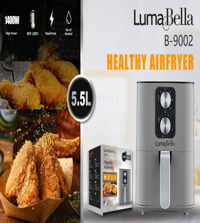 مقلاة طهي هوائية صحية خالية من الزيوت من لومابيلا ، بقوة 1400 وات ، B-9002، سطح طبخ مضاد للالتصاق, تحكم ترموستات قابل للضبط, حاوية الزيت القابلة للانفصال, حماية من الحرارة العالية, مع مؤشر للإضاءة,
