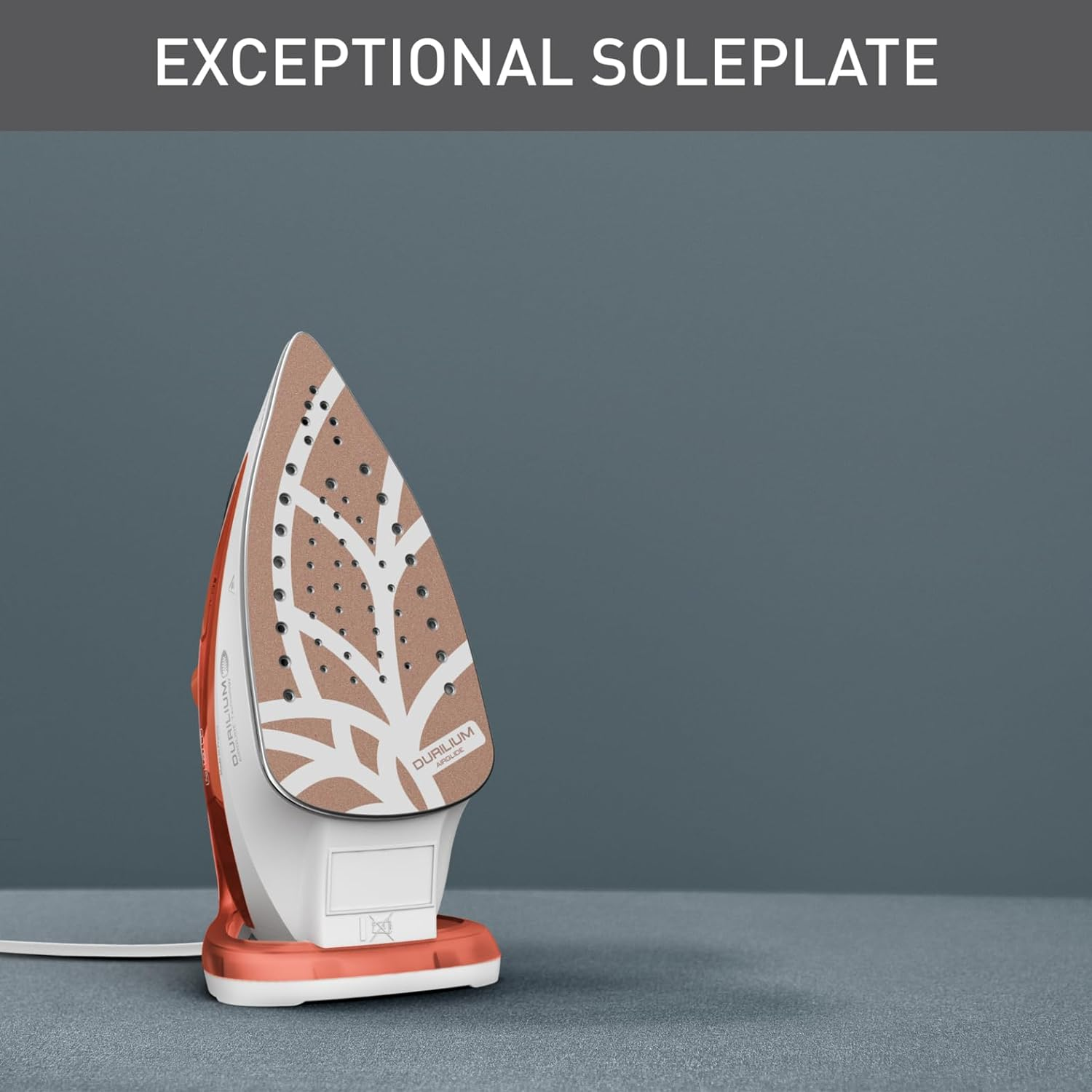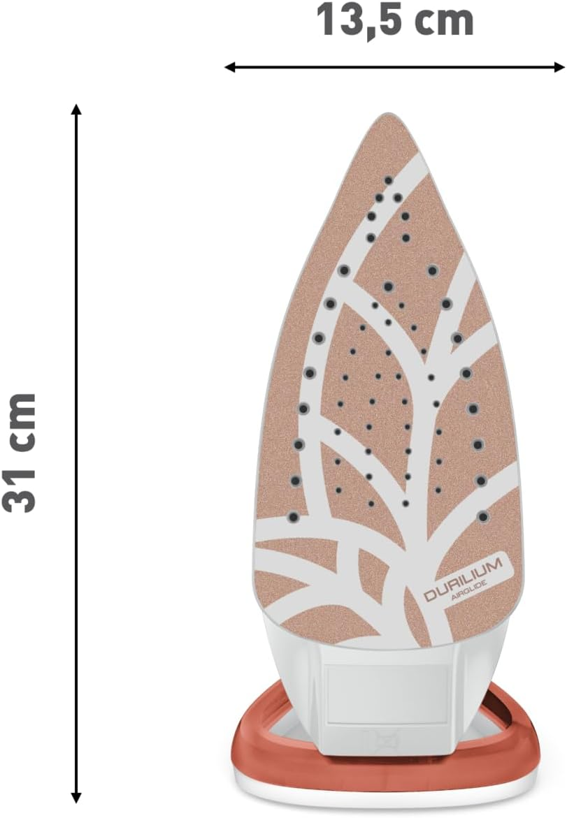 مكواة بخار تيفال إيزي جليس إيكو، تعزيز بخار 260 جم/الدقيقة، بخار مستمر 50 جم/الدقيقة، خزان مياه 270 مل، قاعدة مكواة من الدوريليوم غير لاصقة، إيقاف تلقائي، مضادة للتنقيط، مضادة للتقشر، أبيض وتراكوتا، F